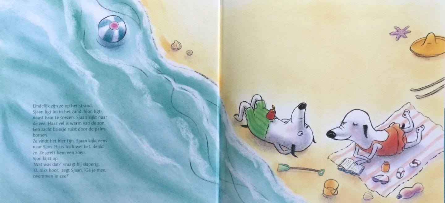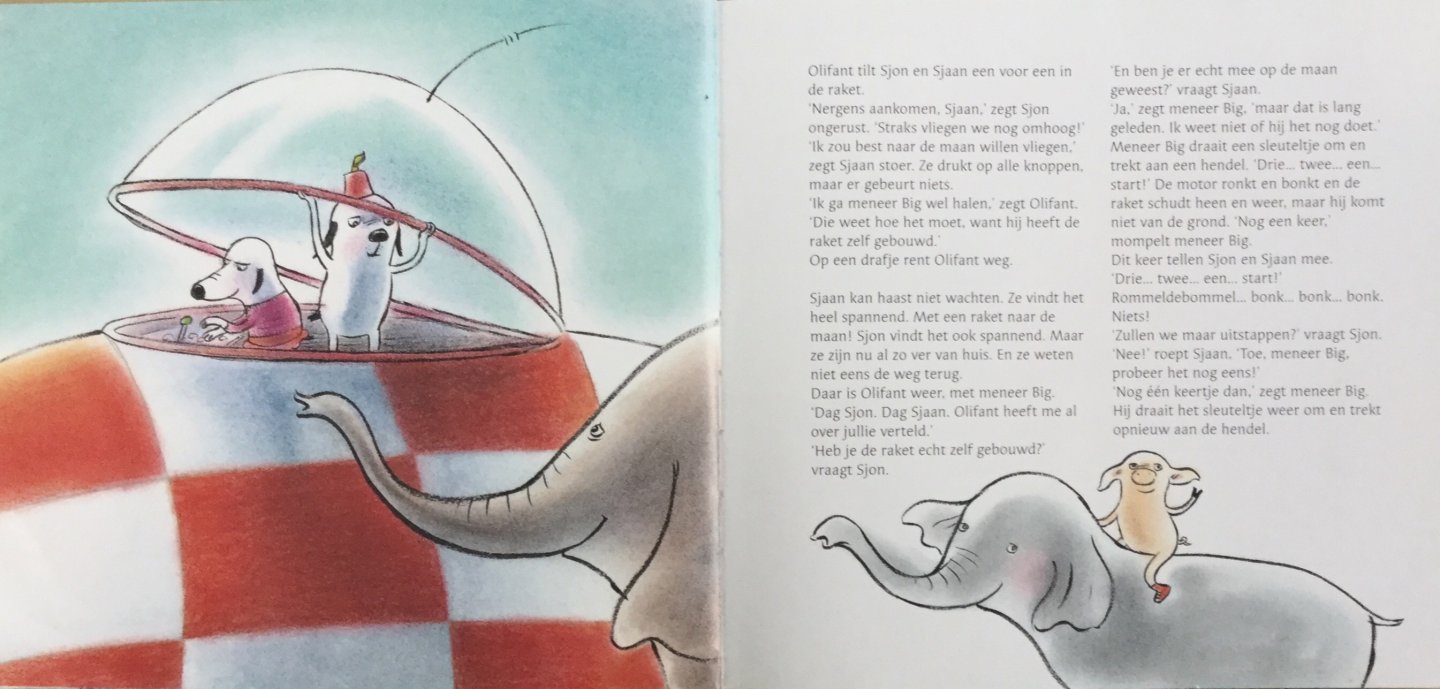 Een vrolijk voorleesboek vol versjes en verhalen over twee aandoenlijke hondjes, nu met gratis luister-cd met verhaaltjes over Sjon en Sjaan, ingesproken door de auteur. Recensie(s) Groot voorleesprentenboek met zes verhalen (van 10 a 14 bladzijden) en 22 verzen (korte en lange) over de twee hondjes Sjon en Sjaan. Vrolijke verhalen waarin Sjon en Sjaan allerlei spannende avonturen beleven: op zee met een zeemonster, op een eiland met een zeeschildpad, in het bos, op reis met een raket, in de sneeuw en op het strand, met een verdrietige paashaas en met een dief die een kraai blijkt te zijn. Bekende figuren uit andere prentenboeken van deze auteur/illustrator zoals meneer Big, Olifant en Willem de beer duiken zo nu en dan ook op. De verzen en versjes tussen de verhalen door slaan qua onderwerp vaak terug op de verhalen. In het midden van het boek staat een Sjon en Sjaan-telvers. Een leuk, vrolijk en gevarieerd voorleesboek over twee sympathieke, lieve hondjes, dat het vooral van de illustraties moet hebben. Warme, vertederende, geestige tekeningen, soms klein, soms paginagroot, die de tekst uitstekend aanvullen en versterken. |