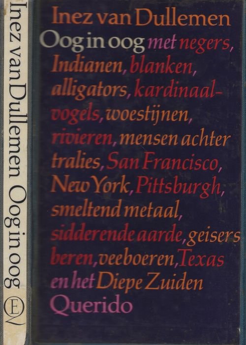 "Oog in oog" is een selectie uit reportages die Inez van Dullemen maakte tijdens haar verblijf in de Verenigde Staten, van 1966 tot 1970. M.a.w. dit is een bundel reisverhalen van binnen uit. Ze beschrijft San Quentin, de Californische gevangenis; stedenals Pittsburgh en New York, de levenswijze van Indianen, verslaafden, de Black Muslims, de lege plantages in het Diepe Zuiden. Steeds weet ze het algemene, herkenbare te beschrijven, met een oog voor het detail, het bijzondere, dat wat haar opvalt. Vaak wordt dat verwoord in gevoelens van deemoed over alles wat verloren is gegaan, in de teleurstelling over vooruitgang en materialisme, omdat die niet leidden tot betere intermenselijke verhoudingen. Ze schrijft op een aandachtige, sensitieve manier over mensen, dieren, landschappen en steden, en over de betrekkingen die daartussen bestaan. Dit doordringende en heel persoonlijke waarnemingsvermogen levert tijdloze beschrijvingen op van Amerika. |