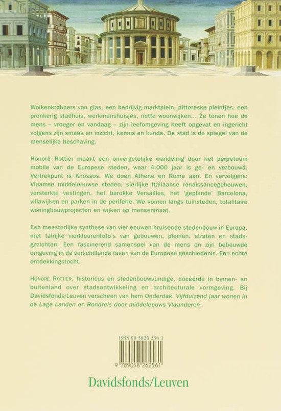 Wolkenkrabbers van glas, een bedrijvig marktplein, pittoreske pleintjes, een pronkerig stadhuis, werkmanshuisjes, nette woonwijken… Ze tonen hoe de mens - vroeger vandaag - zijn leefomgeving heeft opgevat en ingericht volgens zijn smaak en inzicht, kennis en kunde. De stad is de Spiegel van de menselijke beschaving. Honoré Rottier maakt een onvergetelijke wandeling door het perpetuum mobile van de Europese steden, waar 4.000 jaar is ge- en verbouwd. Vertrekpunt is Knossos. We doen Athene en Rome aan. En vervolgens: Vlaamse middeleeuwse steden, sierlijke Italiaanse renaissancegebouwen, versterkte vestingen, het barokke Versailles, het ‘geplande’ Barcelona, villawijken en parken in de periferie. We komen langs tuinsteden, totalitaire woningbouwprojecten... en wijken op mensenmaat. Een meesterlijke synthese van vier eeuwen bruisende stedenbouw in Europa, met talrijke kleurenfoto’s van gebouwen, pleinen, straten en stadsgezichten. Een fascinerend samenspel van de mens en zijn bebouwde omgeving in de verschillende fasen van de Europese geschiedenis. Een echte ontdekkingstocht. HONOR ROTTIER, historicus en stedenbouwkundige, doceerde in binnen - en buitenland over stadsontwikkeling en architecturale vormgeving. Bij Davidsfonds/Leuven verscheen van hem Onderdak. Vijfduizend jaar wonen in de Lage Landen en Rondreis door middeleeuws Vlaanderen. Garengenaaide paperback 297 bladzijden. Formaat 24 x 16,5 x 2 cm heel wat zw/wit en kleurenfoto's register aanwezig. Dit boek is als nieuw en zou 29,95 in de winkel kosten. 15 euro |