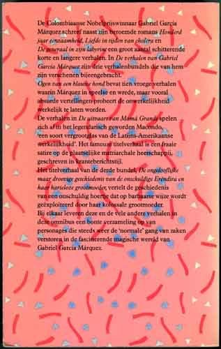 | Meer info: | Een compilatie van de verhalenbundels: Ogen van een blauwe hond. de uitvaart van Mama Grande en de ongelooflijke maar droevige geschiedenis van de onschuldige Erendira en haar harteloze grootmoeder. |