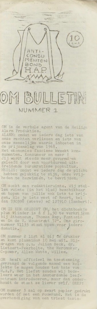 Content: Anti-consumenten bond. Announcements of the first issue of OM, the poetry bundle "Om is een gedicht Om", the Om exhibition; Press release for the history books; A reveiw of a happening with Hapshash and the Coloured Coat at Fantasio; The Arts Lab with Jim Haynes visits Amsterdam; Zen macrobiotics.