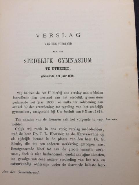 | Titel: | Verslag van den toestand van het Stedelijk Gymnasium te Utrecht gedurende het jaar 1886, 1888, 1889 |