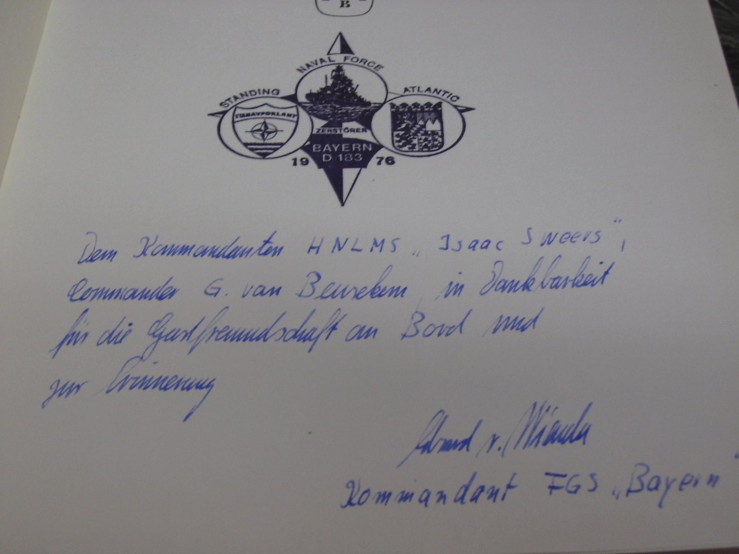 Met pen geschreven op schutblad opdracht van de Kommandant FGS "Bayern" ( zie foto 2) Stempel van de NATO zeeschip 1976 Kaart ontbreekt |