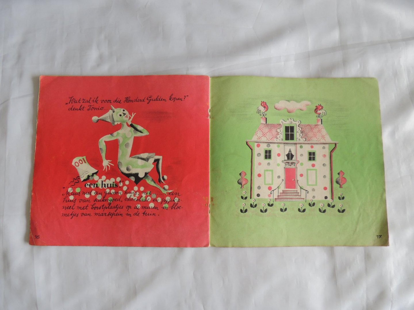 Drie broertjes in clownspakjes ruilen haan voor pit, haan voor geit, en de geit wordt verkocht voor honderd gulden. Daar wordt een suikergoedhuis van gekocht en dat wordt opgegeten door insecten. Gelukkig is uit de pit een prachtige boom gegroeid. Met bijzondere contourloze illustraties, mogelijk met krijt of kleurpotlood gemaakt.