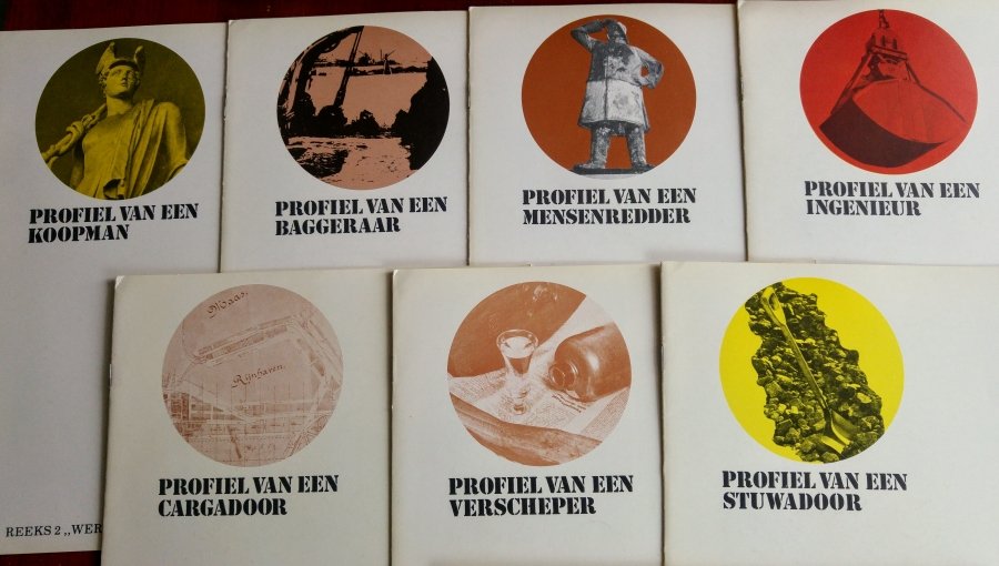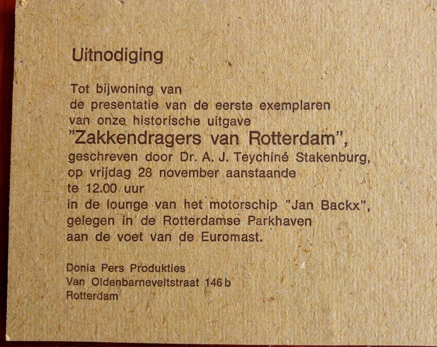 Inhoud: het boek Zakkendragers van Rotterdam plus 7 boekjes over de profielen van een cargadoor, een stuwadoor, een koopman, een baggeraar, een ingenieur, een mensenredder en een verscheper. Verder nog een aparte uitnodiging voor de presentatie van het boek. |