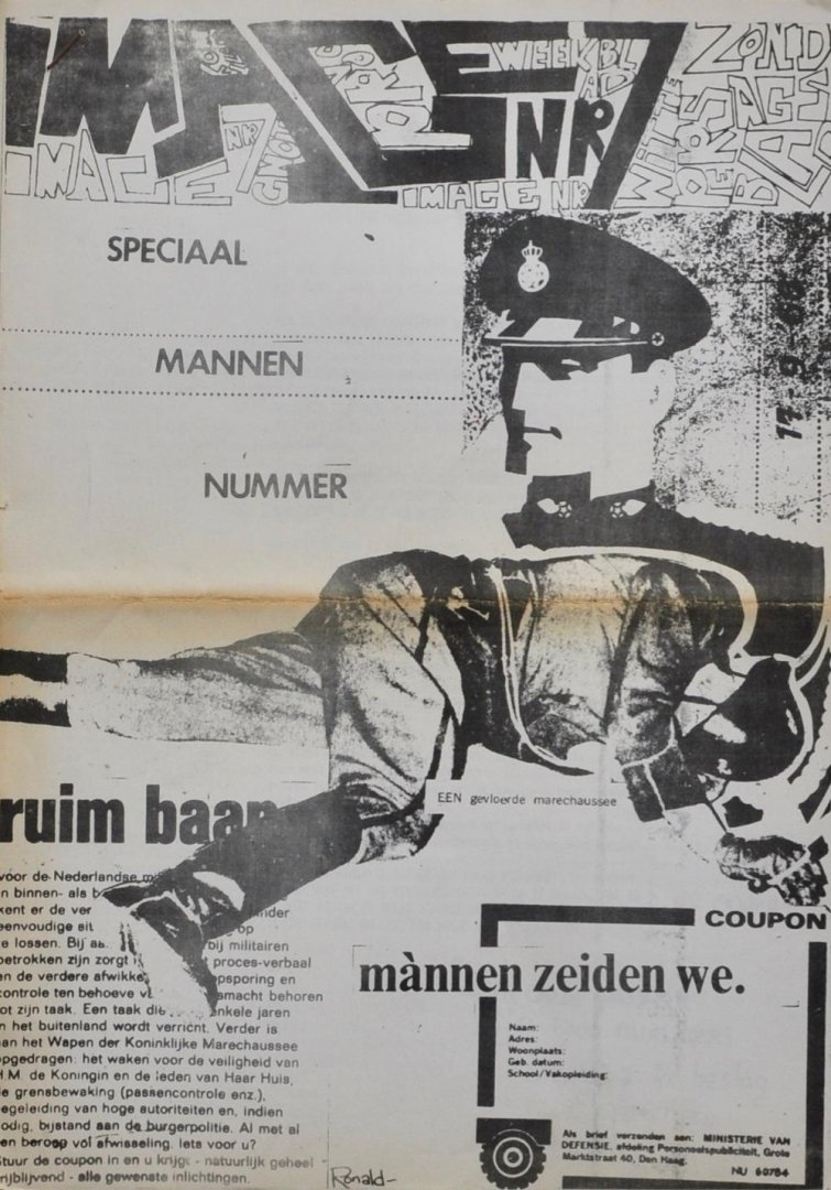 This magazine was not the official Provo magazine, but an alternative publication from more or less the same group. The Dutch Provo movement emerged from happenings held around 1965 at a statue in the centre of Amsterdam. Eventually Provo got elected in the Amsterdam city council. Provo were the predecessors of Yippies and Provo organizations in e.g. New York and Los Angeles. Men special. The white clerks plan; If you are a policeman - Poem by Jhr. Leon van Amstel; Poetry; Cartoon by Ronald. From the collection of active Provo member Ubbo Voute. Condition: Fold over the width; Browning at the fold. Overall condition: Good.