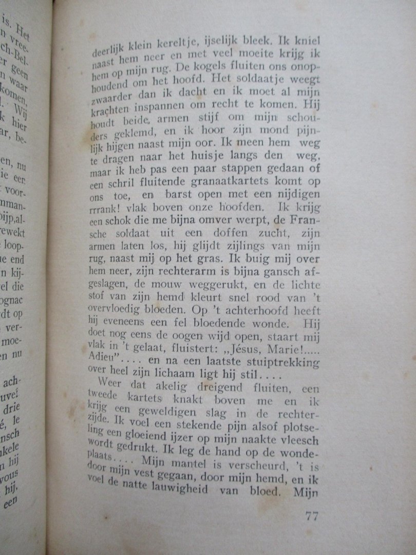 De zeldzame eerste druk. De rug is verstevigd en het titelblad is een kopie. Met een gerepareerd hoekje aan de bovenkant van blz 4-5. Ernest Claes beschrijft zijn belevenissen als soldaat tijdens de Eerste Wereldoorlog. Hij werd zwaar gewond door geschut van granaatvuur en werd krijgsgevangen. |