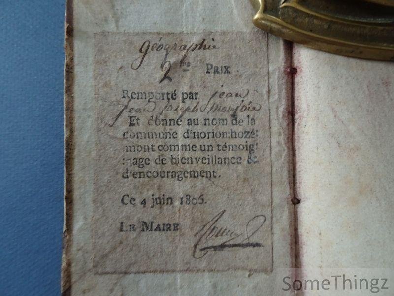 | Meer info: | Avec une vieille billet du prix scolaire contre-collé au premier plat: "2me prix. Remporté par Jean Jean Joseph ... Et donné au nom de la commune d'Horion-Hozément comme un temoignage de bienveillance & d'encouragement. Ce 4 juin 1806. Le Maire ..." Signé par le Maire. (voir photo's) |