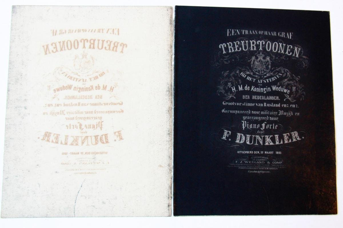 Music sheet: 'Treurtoonen' 1865. Measurements: 325 x 256 mmCondition: Age-related discolouration with a tear in the spine and on the cover and is a bit tattered.Rough outline: Sheet music on the occasion of the death of Her Majesty the Queen Widow and Grand Duchess of Russia etc, called ‘Treurtoonen’. Piano Forte by F. Dunkler and played on March, 17th 1865. Printed by F.J. Weygand & Comp.