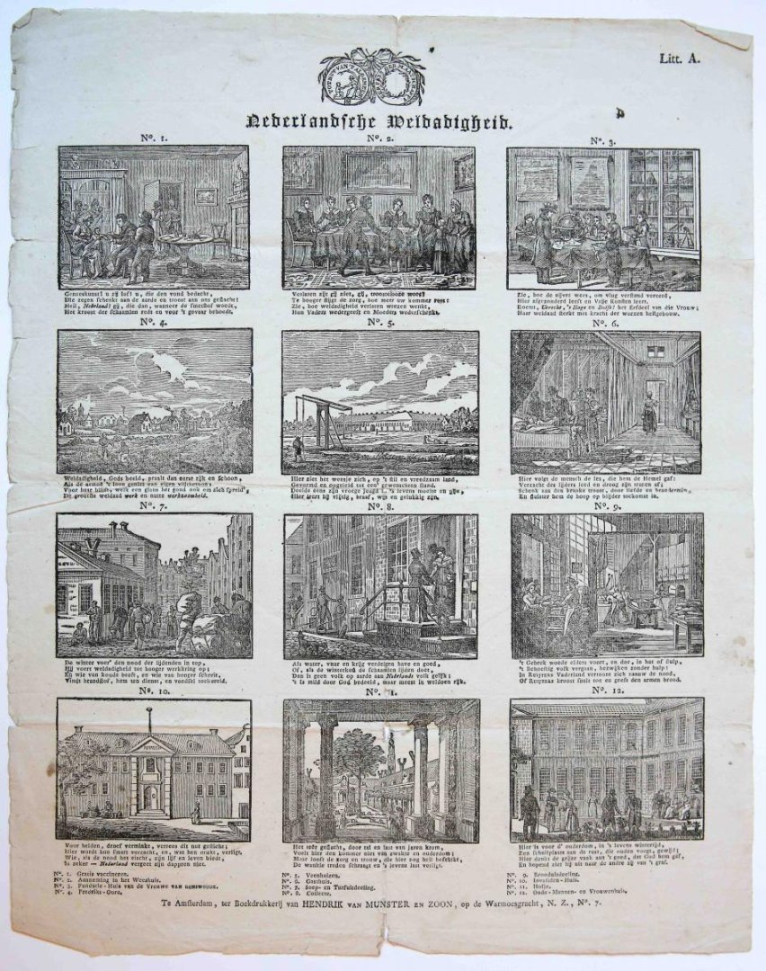 Centsprent: Nederlandsche Weldadigheid, Litt. A. Popular print showing various charitable initiatives, most of which were organised by the Maatschappij van Weldadigheid (Society of Humanitarianism) a Dutch private organisation founded by Johannes van den Bosch in 1818 to help poor families in the aftermath of the Napoleonic French occupation. The initiatives include: free vaccinations, admission to an orphanage, the ‘Fundatie van Renswoude’, Frederiksoord, the orphanage in Veenhuizen, a ‘gasthuis’, the distribution of soup and peat (turf), donations, the distribution of bread, a home for the disabled, a courtyard in an alms house, and a retirement home.At the top, the seal ‘Tot nut van ‘t algemeen’ of the Maatschappij tot Nut van ’t Algemeen. This association granted publishers permission to use their seal on prints that they had established to be of moral and pedagogical value.Signed: A. Cranendonck; inscription on verso: W.J. Venema.Amsterdam, Hendrick van Munster en Zoon, (1819 - 1835), address mentioned on the print: ‘Te Amsterdam, ter Boekdrukkerij van Hendrik van Munstern en Zoon, op de Warmoesgracht, N. Z., No. 7’; Amsterdam; lettered ‘Litt. A.’ in upper right corner. l 12 woodcut illustrations (each ca. 65 x 87 mm) on handmade paper; under each image a 4-line verse, above each image a number corresponding to a title at the bottom; text in letterpress; total: 420 x 335 mm; Pro Patria watermark; folded three times, some small holes along the folds, small tear at the bottom. De Meyer p. 236, Boerma p. 790 (Munster A).