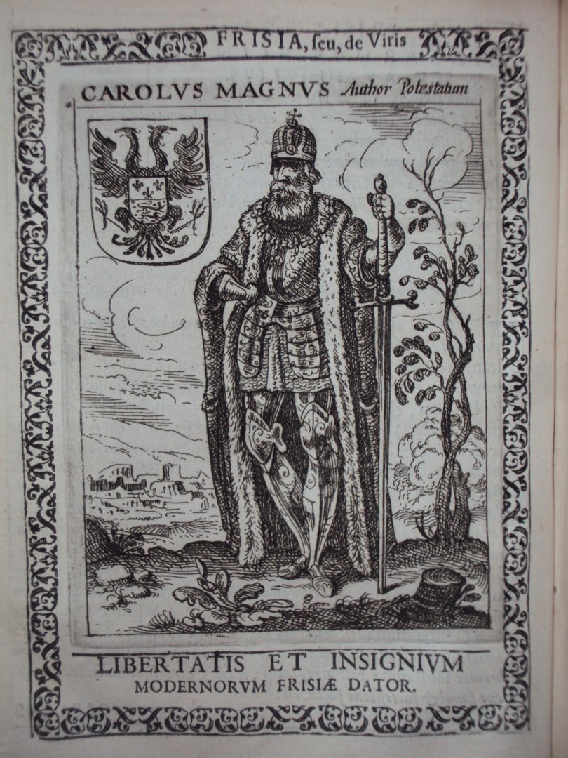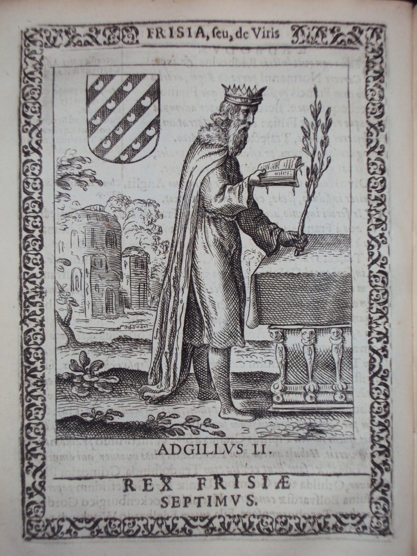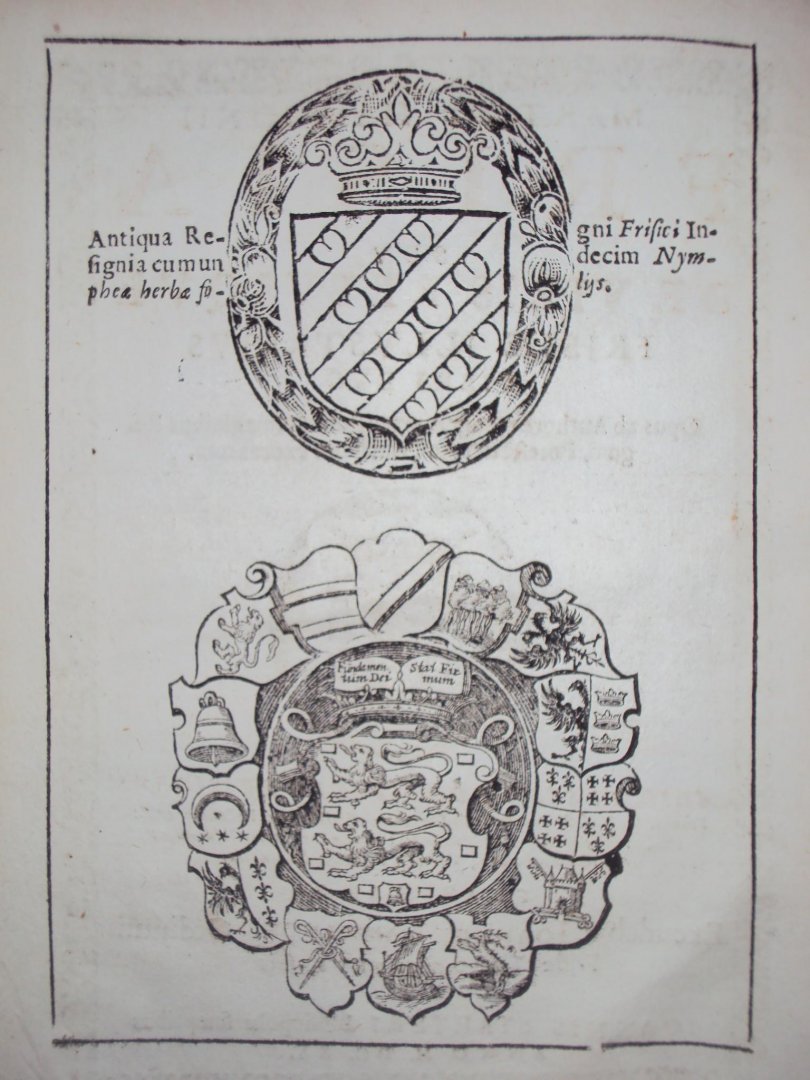 Complete with: title printed in black and red within woodcut border and w. woodcut vignette, 2 large woodcut coats of arms on verso titlepage, etched portrait of the author and 53 full-page portraits of Frisian rulers within woodcut borders by F. van Harlingen. |