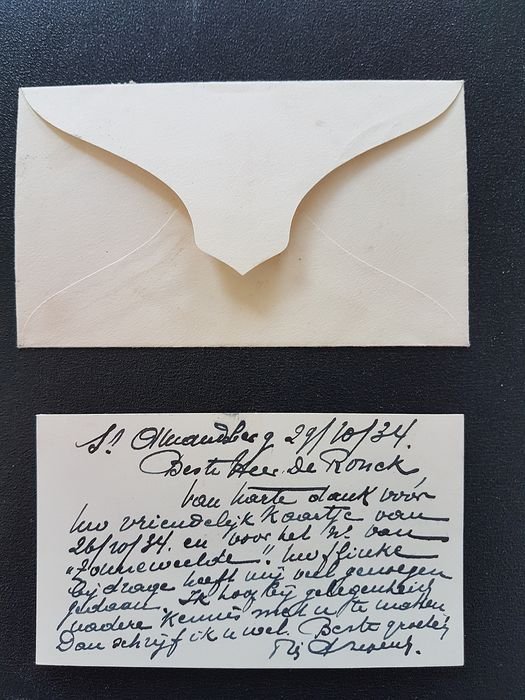 De socialistische Vlaamse onderwijzer Piet Schepens (1901-1967) ontpopte zich na zijn studie Zweeds, Noors, Deens en Fins tot de belangrijkste verdediger van de Scandinavische literatuur en cultuur in Vlaanderen. In 1931-1933 verscheen zijn monumentale monografie over August Strindberg, in twee, geïllustreerde delen. Het hier aangeboden gebrocheerde duo is (zoals gebruikelijk) niet bepaald postfris, met vergeling en vochtsporen op het omslag, maar het (opengesneden) binnenwerk is smetteloos. Dit zijn de nummers 804 en 340 van de oplage van duizend exemplaren op Featherweight-papier. Beide kloeke delen zijn gesigneerd, niet alleen door de auteur, maar ook door de vroegere bezitter, Sylvain De Rouck. Ingelegd is een handbeschreven visitekaartje van Schepens (in envelop) waarmee hij criticus De Rouck bedankt "... voor het nummer van 'Zonneweelde'. Uw flinke bijdrage heeft mij veel genoegen gedaan. Ik hoop bij gelegenheid nadere kennis met u te maken." (29-10-1934)