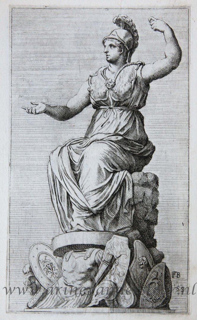 Bijzonderheden: Minerva, seated, turned to left, her hands raised, with military trophies at her feet; after the statue that was once in the Campidoglio square, on the top of the fountain, where now stands a copy in different marbles, with the name of Rome Goddes...