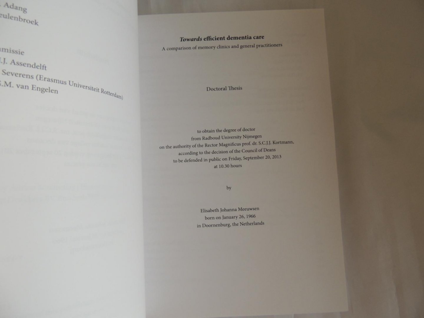 | Schrijver: | Elisabeth Johanna Meeuwsen E. Els; Promotor: Prof. dr. M.G.M. Olde Rikkert, Co-promotoren: Dr. R.J.F. Melis, Dr. E.M.M. Adang, Dr. O.V. Meulenbroek. - Auteursnaam op omslag: Els Meeuwsen |