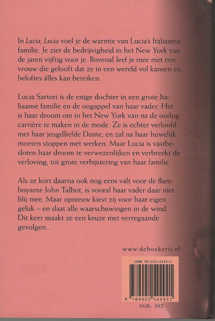 Omslagontwero Marlies Visser Omslagfoto Time life Pictures Getty Images In Lucia, Lucia voel je de warmte van Lucia's Italiaanse familie. Je ziet de bedrijvigheid in het New York van de jaren vijftig voor je. Bovenal leef je mee met een vrouw die gelooft dat ze in een wereld vol kansen en beloftes es kan bereiken. Lucia Sartori is de enige dochter in een grote Italiaanse familie en de oogappel van haar vader. Het is haar droom om in het New York van na de oorlog carri te maken in de mode. Ze is echter verloofd met haar jeugdliefde Dante, en zal na haar huwelijk moeten stoppen met werken. Maar Lucia is vastbesloten haar droom te verwezenlijken en verbreekt de verloving, tot grote verbijstering van haar familie. Als ze kort daarna ook nog eens valt voor de flamboyante John Talbot, is vooral haar vader daar niet blij mee. Maar opnieuw kiest zij voor haar eigen geluk - en slaat alle waarschuwingen in de wind. Dit keer maakt ze een keuze met verregaande gevolgen… |