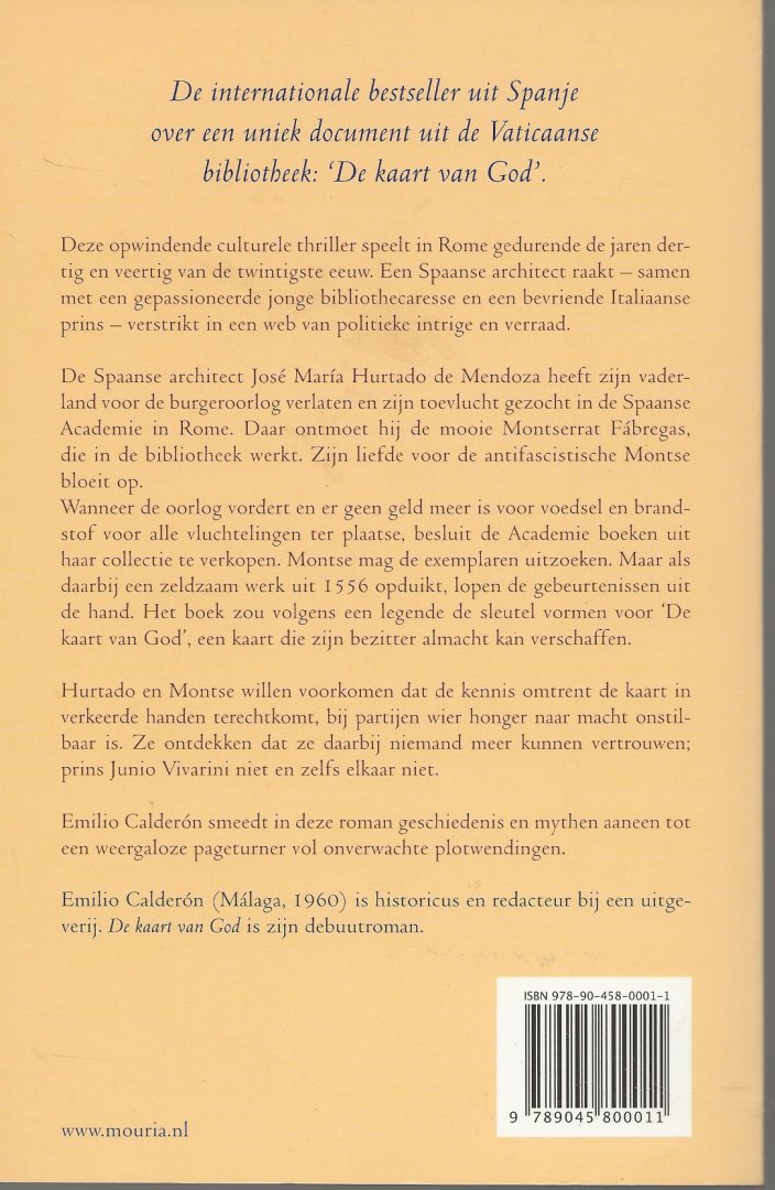 Omslagontwerp Sudio Jan de Boer Omslagfotografie Michael Maslan Historic Photographs - Corbis Deze opwindende roman speelt tijdens de periode van opkomst en ondergang van het fascisme, waarin een jonge Spaanse architect in Rome - samen met een gepassioneerde jonge bibliothecaresse en een bevriende Italiaanse prins - belandt in een web van politieke intrige, liefde en verraad. José Maria hurtado is een Spaanse architectuurstudent die zijn vaderland voor de burgeroorlog heeft verlaten en zijn toevlucht heeft gezocht in de Academia Espanola in Rome. Daar ontmoet hij de mooie Montserrat (Montse) Fábregas, een antifascistische bibliothecaresse. Naarmate de oorlog vordert en voedsel en bradstof schaars worden, besluit ze boeken uit de collectie van de Academia te verkopen. Maar wanneer een zeldzaam boek ui 1556 opduikt, lopen de gebeurtenissen uit de hand. Het boek zou een aanwijzing bevatten waar De kaart van God zou zijn, een kaart die zijn bezitter almacht zou geven. In een tijd waarin velen naar macht hunkeren, ontstaat er een spel waarin Hurtado en Montse niemand meer kunnen vertrouwen; prins Junio Vivarini niet en zelfs elkaar niet. Emilio Caldéron smeedt in deze roman geschiedenis en mythen aaneen tot een weergaloze pageturner, een culturele thriller vol onverwachte plotwendigen die de lezer tot het einde toe geboeid houdt. |