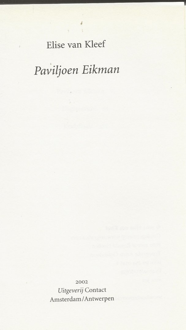 Als Eva, een twintigjarige studente aan de toneelacademie, waan en werkelijkheid niet meer van elkaar kan onderscheiden, wordt ze opgenomen in Paviljoen Eikman, een kliniek in de bossen. Zelfs deze gesloten gemeenschap ervaart ze nog als een wereld vol gevaar en geheimen. De normaalste begroeting interpreteert ze als een gecodeerde boodschap, al dan niet bedoeld om haar de wereld van de ondergang te laten redden. In een sobere, maar indringende stijl neemt Elise van Kleef de lezer mee in de gedachtespinsels van Eva. Door haar ogen zien we hoe onverschillig en bot de artsen vaak zijn en hoe - letterlijk - gevoelloos de psychiatrische wereld in elkaar zit. We ervaren de werking van medicatie en het surreële van therapeutische gesprekken. Paviljoen Eikman is een roman over volwassen worden in een grillige, veeleisende wereld. Maar bovenal is het een gepassioneerd verhaal over de onverwoestbaarheid van de geest. |