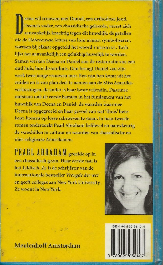 Gebruikers Sporen en Geel verkleuring Foto achterplaat Steven Spewock Omslagfoto Francesca Woodman Deena wil trouwen met Daniël, een orthodoxe jood. Deena's vader, een chassidische geleerde, verzet zich aanvankelijk krachtig tegen dit huwelijk: de getallen die hebreeuwse letters van hun namen symboliseren, vormen bij elkaar opgeteld het woord verdriet. Toch lijkt het aanvankelijk een gelukkig huwelijk te worden. Samen werken Deena en Daniël aan de restauratie van een oud huis, hun droomhuis.Dan brengt Daniël van zijn werk twee jonge vrouwen mee. Een van hen komt uit het zuiden en is van plan deel te nemen aan de Miss Amerikaverkiezingen, de ander is haar beste vriendin. Daarmee ontstaat ook de eerste barsten in het fundament van het huwelijk van Deena en Daniël: de waarden waarmee Deena is opgegroeid en haar gevoel van wat thuis betekent, komen op losse schroeven te staan. |
