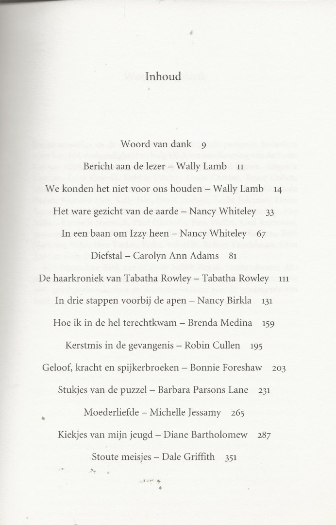 Unieke en fascinerende autobiografische verhalen, soms rauw, vaak ontroerend - onder redactie van de auteur van Vergeef me en Walvismuziek. Recente foto's van de auteurs Richard Roselle Sinds vier jaar geeft Wally Lamb een cursus creatief schrijven aan een groep vrouwelijke gevangenen in een Extra Beveiligde Inrichting. Aanvankelijk stonden de vrouwen wantrouwend tegenover hem, maar ook tegenover elkaar en het schrijven. Naarmate de tijd echter verstreek lieten ze hun argwaan varen, namen de pen ter hand en ontdekten hun eigen stem. Sommige van hen beschrijven hoe ze gevangen zaten in een wereld van mishandeling, verwaarlozing en misbruik, lang voor ze in aanraking kwamen met politie en justitie. Anderen laten zien hoe ze tijdens hun gevangenschap inzicht kregen in de omstandigheden die tot hun misdrijf hadden geleid en hoe ze de kracht vonden een nieuwe wending aan hun leven te geven. Het schrijven zelf speelde daarin een belangrijke rol. Toch zijn dit niet alleen hartverscheurende verhalen. Want wie de wanhoop onder ogen ziet, kan die mede dankzij humor, geloof en hoop overwinnen. Ook daarvan getuigt dit fascinerende boek. Van binnen uit geschreven geeft een wrang beeld van wat er in een mensenleven mis kan gaan. Want dat deze vrouwen gevangenen zijn en wij dit boek in vrijheid kunnen lezen, ligt niet zozeer aan ons eigen voorbeeldige karakter, maar vooral aan de omstandigheden waaronder wij, en zij, zijn opgegroeid. |