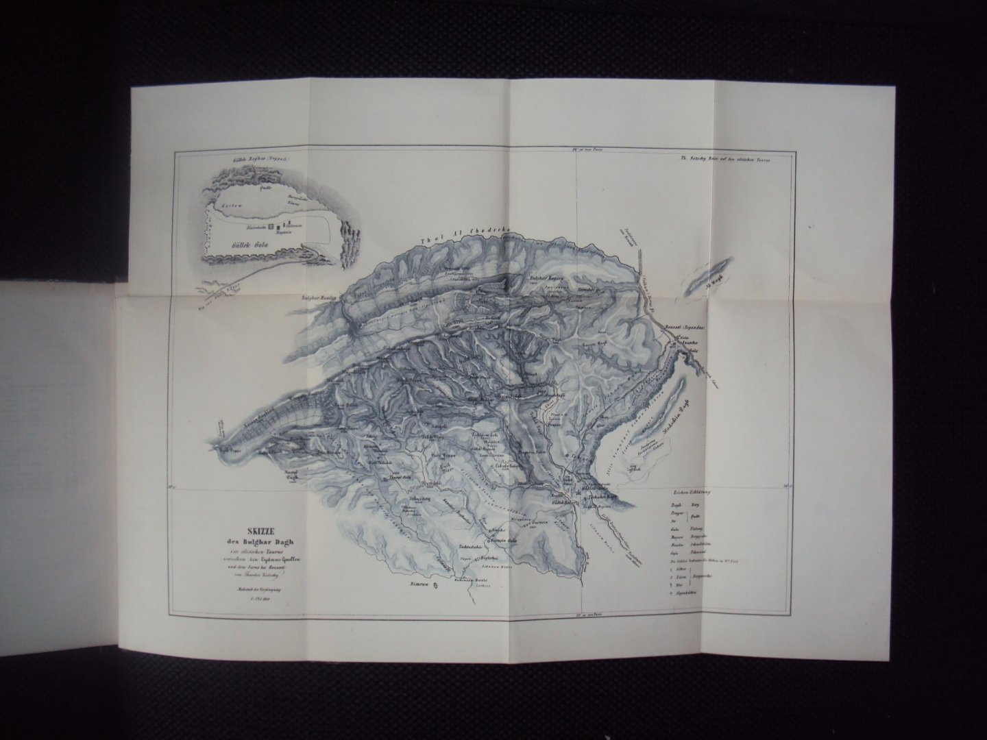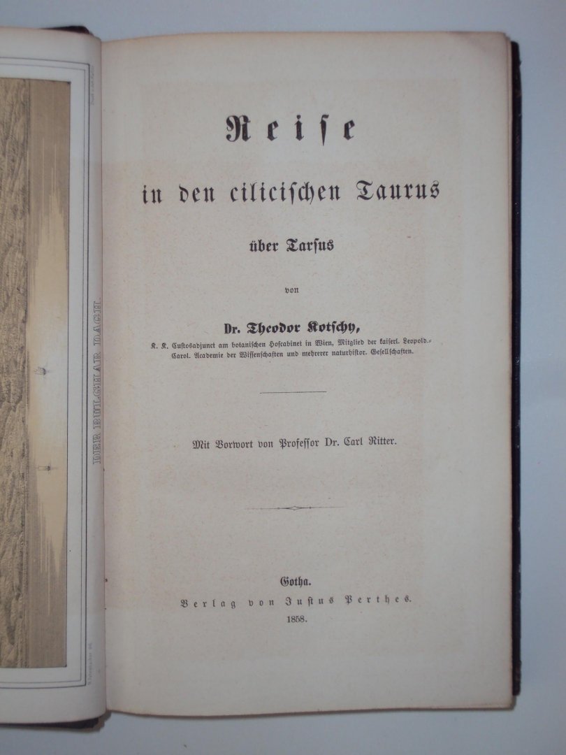 Theodor Rotschy - Reise in den Cilicischen Taurus - Gotha, Justus Berthes, 1858 - 443 pp - original hleather - 22,5 x 14,5 cm Complete with lithographic frontispiece of Bulgar Dagh, fold out map and fold out plants chart travel through Turkey, Anatolia and little Asia |