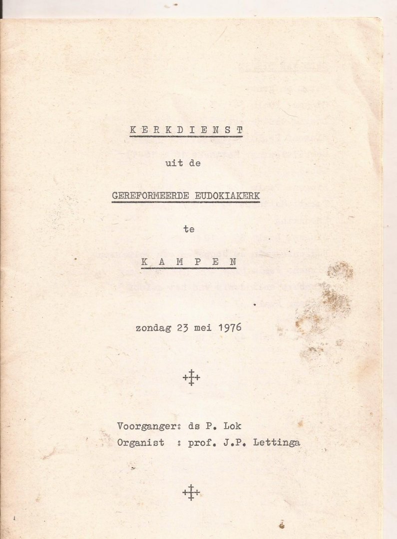| Titel: | Kerkdienst uit de Gereformeerde Eudokiakerk te Kampen. Zondag 23 Mei 1976. Voorganger Ds. P. Lok, Organist Prof. J.P. Lettinga, |