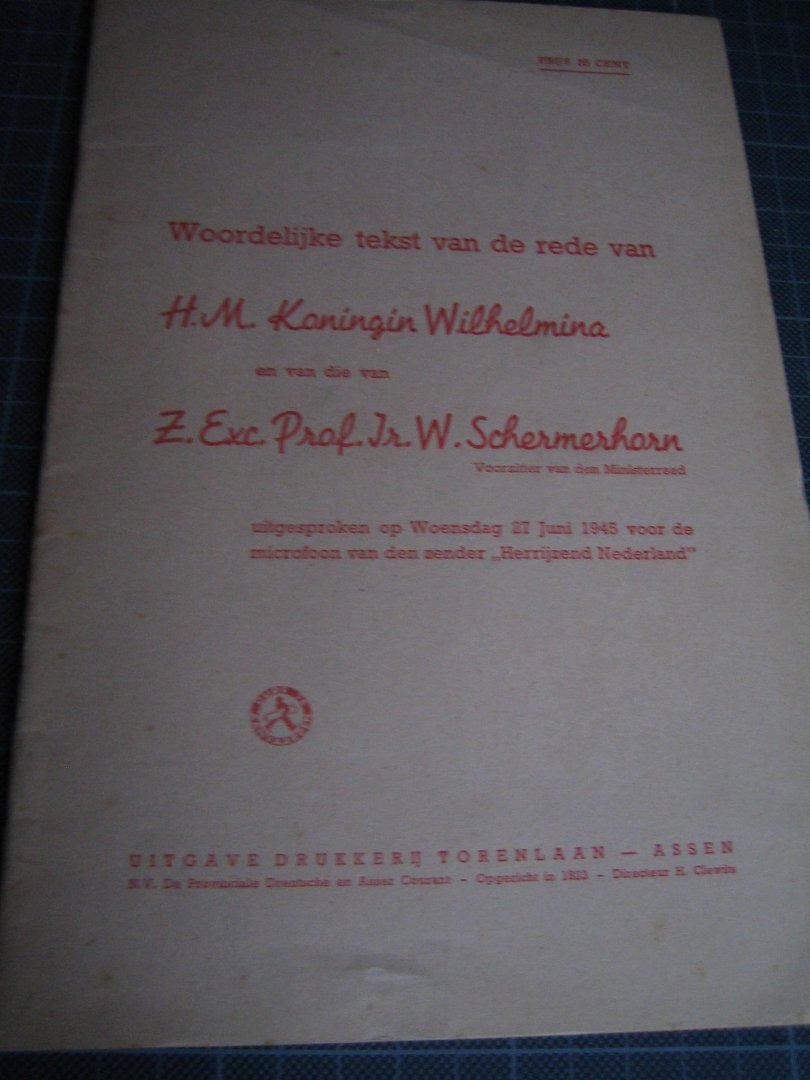 | Titel: | Woordelijke tekst van de rede van HM Koningin Wilhelmina en van die van Z. Exc. Prof. Ir. W. Schermerhorn |