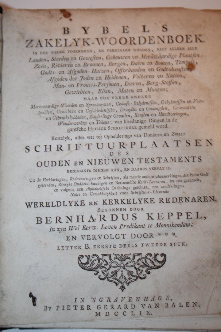 | Titel: | Bybels Zakelyk Woordenboek … begonnen door Bernardus Keppel en vervolgt door ***. Letter B. Tweede stuk |