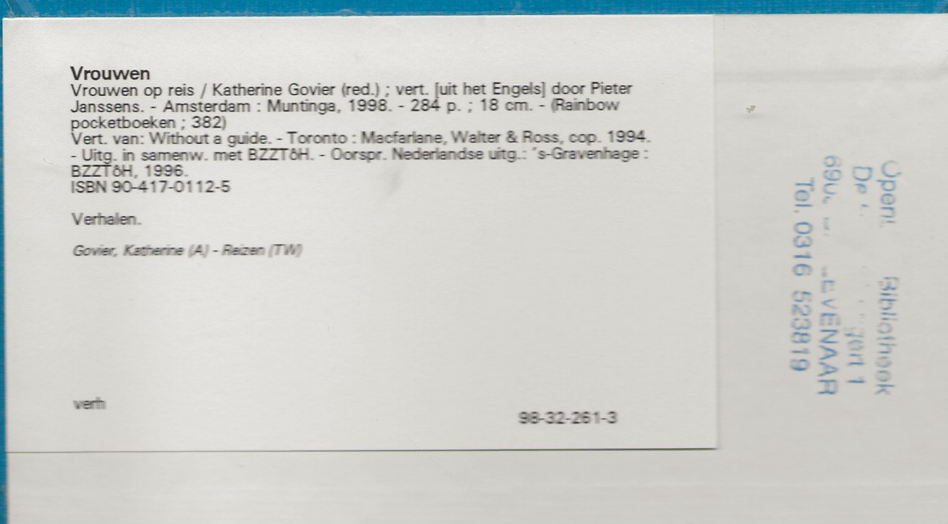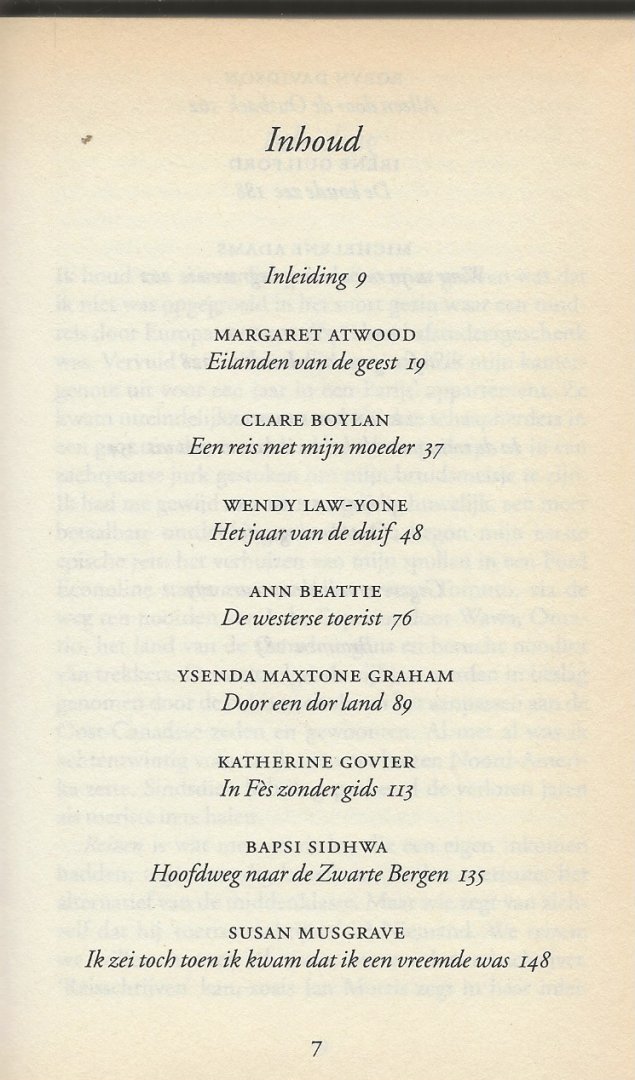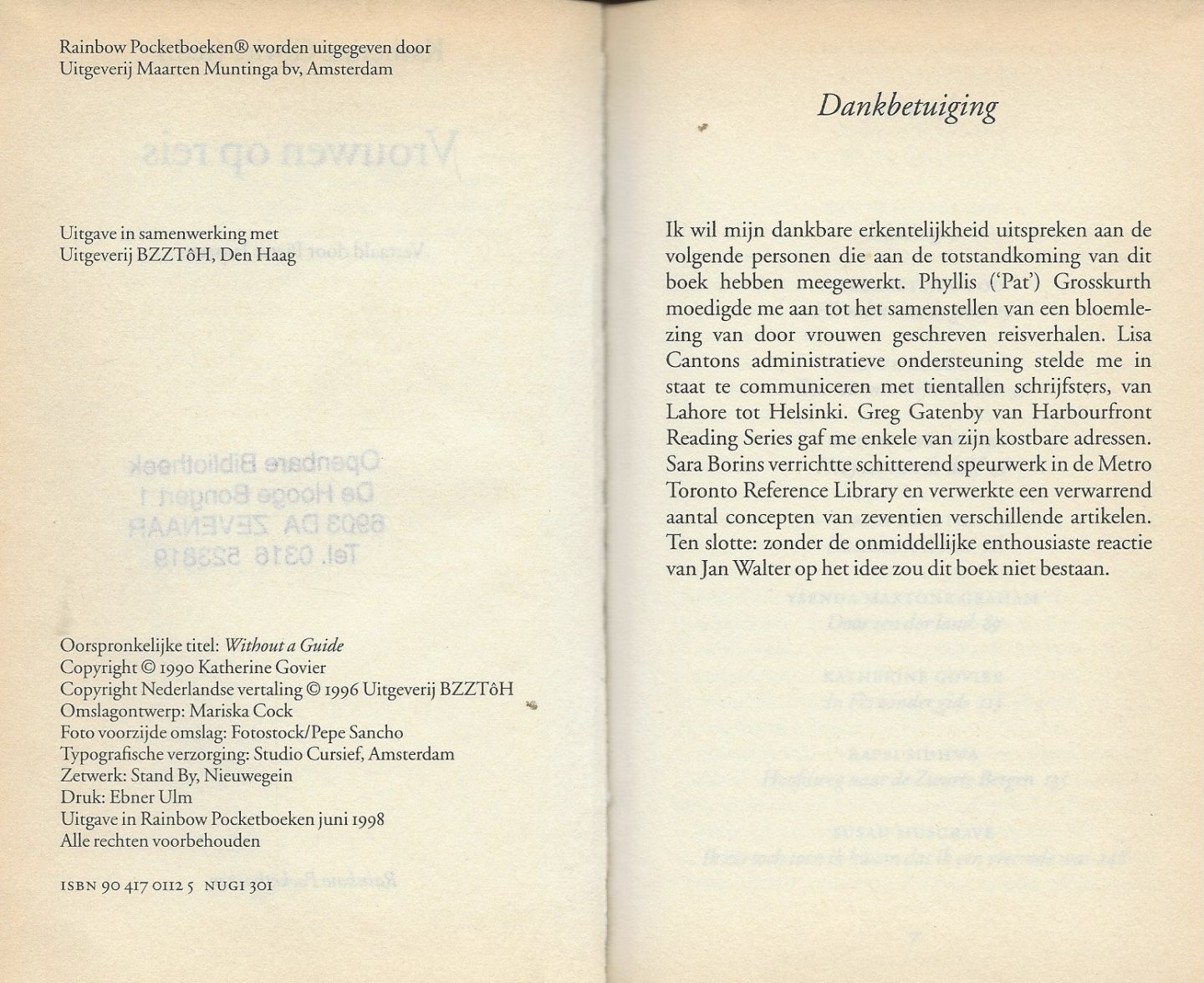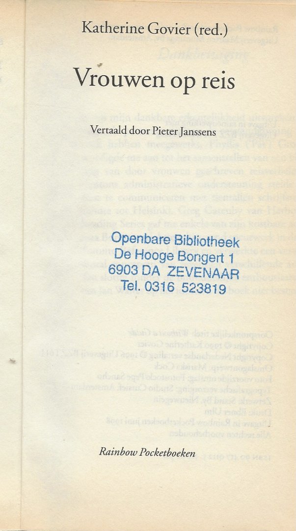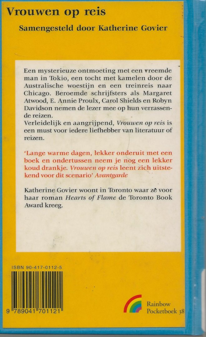 Vrouwen op reisSamengesteld door Katherine GovierEen mysterieuze ontmoeting met een vreemde man in Tokio, een tocht met kamelen door de Australische woestijn en een treinreis naar Chicago. Beroemde schrijfsters als Margaret Atwood, E. Annie Proulx, Carol Shields en Robyn Davidson nemen de lezer mee op hun verrassende reizen.Verleidelijk en aangrijpend, Vrouwen op reis is een must voor iedere liefhebber van literatuur of reizen.Anders dan vroeger, toen reizen slechts voorbehouden was aan rijke douarieres en excentrieke vrouwen, zijn er de afgelopen decennia veel vrouwen die zich, met een eigen inkomen, over de aardbol bewegen. Voor de medewerksters aan deze bloemlezing, allen romanschrijfster of dichteres, betekent reizen ontsnappen aan huis en haard, koetjes, kalfjes en kinderen. Op veelal luchthartige wijze vertellen ze over, soms avontuurlijke, ervaringen in een wereld waar de commercie met haar opdringerigheid het reizen grotendeels tot toerisme heeft gereduceerd. Onderhoudende, wat oppervlakkige, verhalen die zich afspelen in de jaren tachtig en negentig