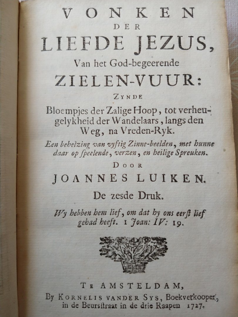 | Titel: | Vonken der liefde Jezus, van het God begeerende zielen-vuur : zynde bloempjes der zalige hoop, tot verheugelykheid der wandelaars, langs den weg, na vreden-ryk : een behelzing van vyftig zinne-beelden, met hunne daar op speelende, |
