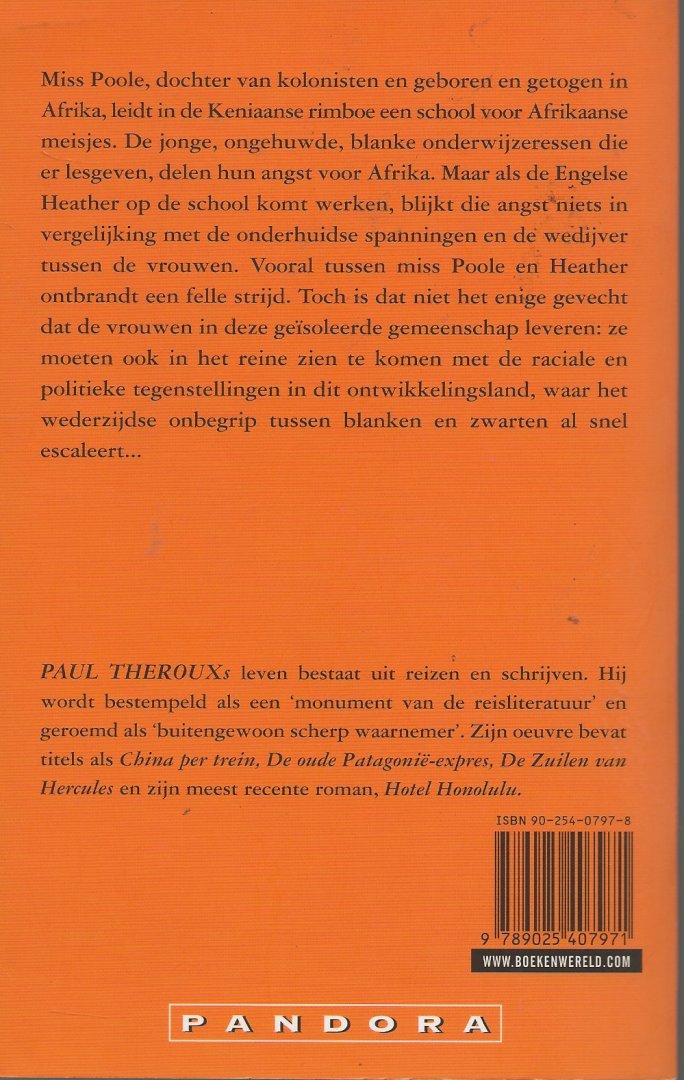 Omslagillustratie Image Store te Amsterdam PAUL THEROUX SPELENDE MEISJES Miss Poole, die als dochter van kolonisten in Afrika geboren en getogen is, leidt in de keniaanse rimboe een school voor Afrikaanse meisje. De jonge, ongehuwde, blanke onderwijzeressen die er les geven, delen hun angst voor Afrika. Maar als de Engelse Heather op de school komt werken, blijkt die angst niet op te wegen tegen de onderhuidse spanningen en de wedijver tussen de vrouwen. Leder van hen probeert op eigen wijze te overleven in deze ge leerde gemeenschap en vooral tussen miss Poole en Heather ontbrandt een felle strijd. Toch is dat niet het enige gevecht dat de vrouwen leveren: ze moeten ook in het reine zien te komen met de raciale en politieke tegenstellingen in dit land in ontwikkeling, waar het wederzijdse onbegrip tussen blanken en zwarten snel escaleert. HET LEVEN VAN PAUL THEROUX BESTAAT UIT REIZEN EN SCHRIJVEN. HIJ WORDT BESTEMPELD ALS EEN MONUMENT VAN DE REISLITERATUUR EN GEROEMD ALS 'BUITENGEWOON SCHERP WAARNEMER'. 'In Theroux zie je de perfecte symbiose van de reisschrijver en de romanschrijver.' STANDAARD DER LETTEREN 'Theroux is een buitengewoon scherp waarnemer met oog voor zowel het detail als het algemeen patroon, en met een kleurrijke stijl die onafgebroken tot aandacht dwingt.' NRC HANDELSBLAD |