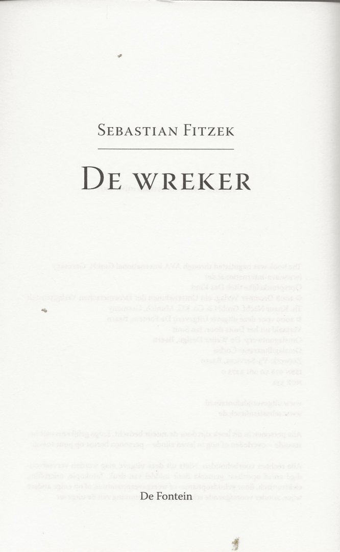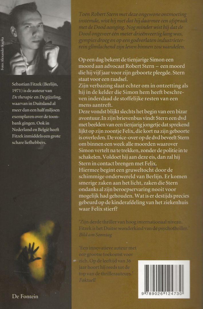 | Schrijver: | Fitzek, Sebastian . Vertaald uit het duits door Jan Smit Omslagontwerp De Weijer Design te Baarn |
