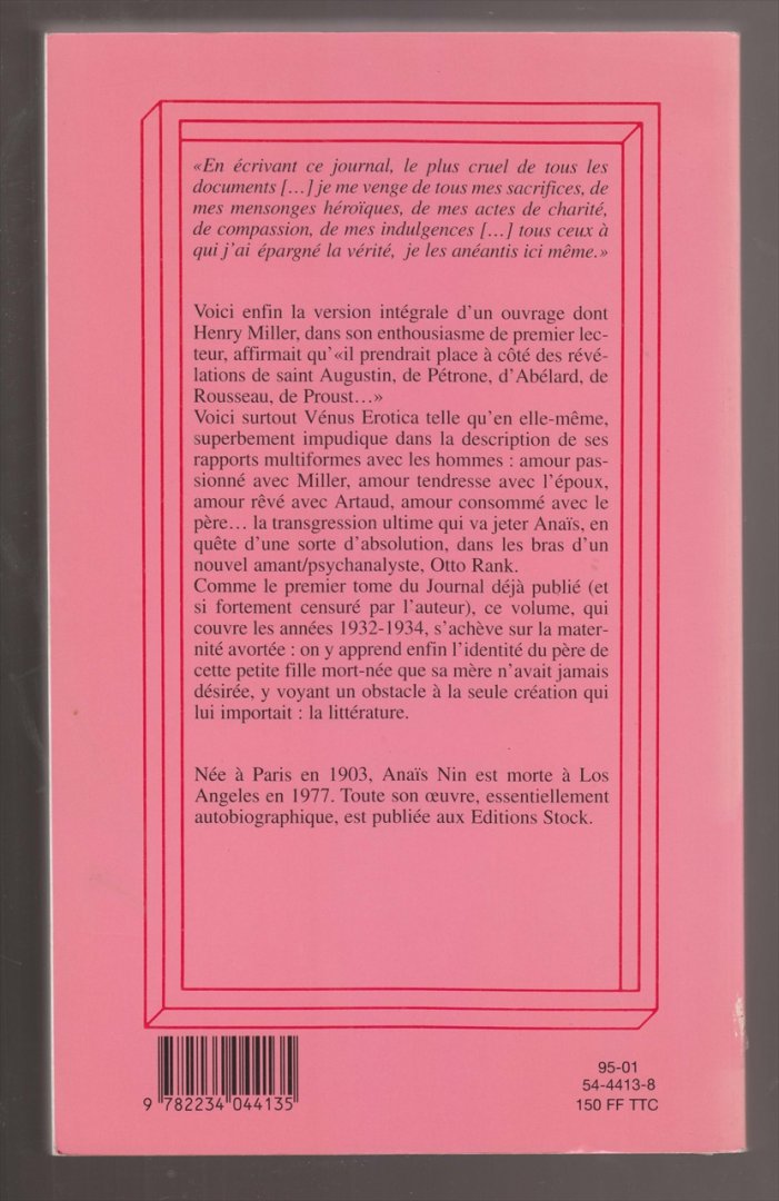 Inceste. Tirés du Journal de l'Amour. Journal inédit et non expurgé des années 1932 - 1934. Traduit de l'anglais par Béatrice Commengé. Stock, Paris. 1995. In-8 broché de 515 pages. 14 x 22½ x 2¾ x 2¾ cm. 690 gr. Titre original 'Incest' from 'A journal of love' - 'the unexpurgated diary of Anaïs Nin 1932-1934' traduit de l'anglais par Béatrice Commengé. ISBN-13 978 2234 04413 5. "En écrivant ce journal, le plus cruel de tous les documents [...] je me venge de tous mes sacrifices, de mes mesonges héroïques, de mes actes de charité, de compassion, de mes indulgences [...] tous ceux à qui j'ai épargné la vérité, je les anéantis ici même." Voici enfin la version intégrale d'un ouvrage dont Henry Miller, dans son enthousiasme de premier lecteur, affirmait qu' "il prendait place à côté de révélations de saint Augustin, de Pétrone, d'Abélard, de Rousseau, de Proust..." Voici surtout Vénus Erotica telle qu'en elle-même, superbement impudique dans la description de ses rapports multiformes avec les hommes : amour passioné avec Miller, amour tendresse avec l'époux, amour rêvé avec Artaud, amour consommé avec le père ... la transgression ultime qui va jeter Anaïs, en quête d'une sorte d'absolution, dans les bras d'un nouvel amant/pscyhanalyste, Otto Rank. Comme le premier tome de Journal déjà publié (et si fortement censuré par l auteur), ce volume, qui ouvre les années 1932-1934, s'achève sur la maternité avortée : on y apprend enfin l'identité de père de cette petite fille mort-née que sa mère n'avant jamais désirée, y voyant un obstacle à la secule création qui lui importait : la littérature. Très bel exemplaire. Très bon état. BOOKNUMBER: 22589 |