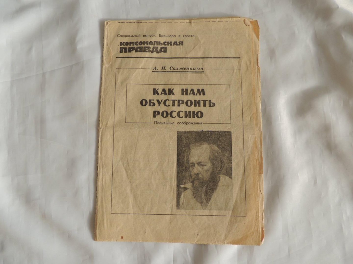 A standalone special issue of Komsomolskaya Pravda newspaper from 09/18/1990. Printed as a brochure in the newspaper. 16 p. The first publication of the Nobel laureate' “swan song”. This is essay on the future of Russia by Solzhenitsyn, who was living at that time in the USA. The article was published at the end of Soviet era in a state that was falling apart Komsomolskaya Pravda and Literaturnaya Gazeta at the same day. In this essay, Solzhenitsyn review and describes the past of his Homeland, searches for parallels with the Soviet Union warns of future problems – basically anticipating the catastrophe that happened a little more than a year later, in 1991. The publication caused a state-wide response among the people of the USSR. However, there were no simple and quick answers about how to cope with the crisis and Solzhenitsyn himself later remarked - “I, unfortunately, have not been heard.” |