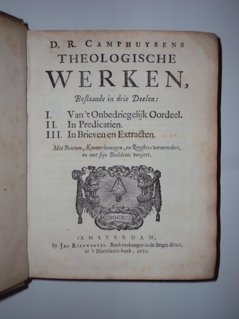 D.R. Camphuysens Theologische werken - Amsterdam, Jan Rieuwertsz, 1682 - vellum - 21 x 17,5 cm Bestaande in drie Deelen: I Van 't onbedriegelijk oordeel II In predicatien III In brieven en extracten Rugvermelding Opera Camphuysen |
