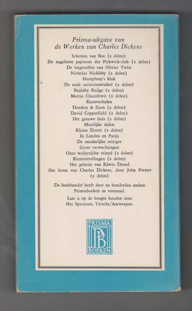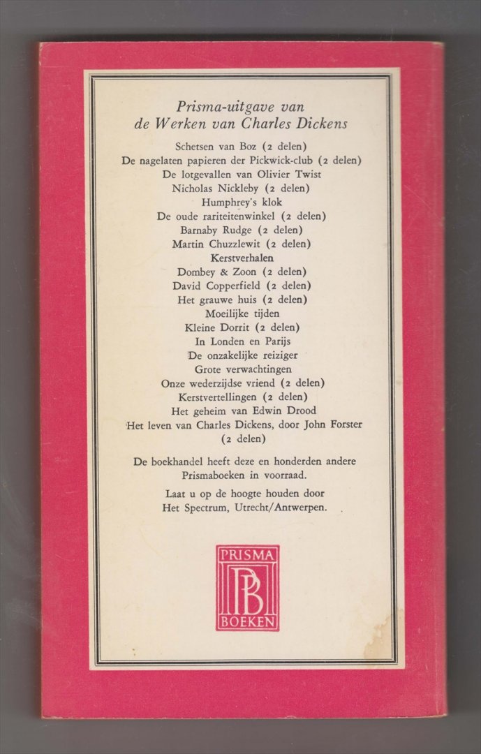 | Uitgever: | Spectrum, Utrecht / Antwerpen. z.j. [1955?]. Tweede druk. Prisma Pocket met gekleurde bladsneden. Oorspronkelijke titel Nicholas Nickleby, 1837. Nederlands van Jan Nieuwenhuis. Geïllustreerd met de oorspronkelijke prenten van Phiz (Hablôt K. B |