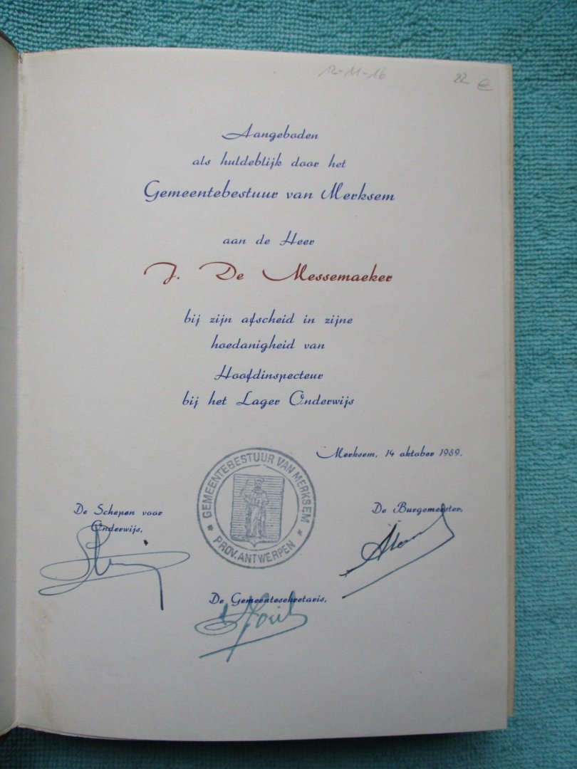 Luxe-uitgave.met handtekeningen van burgemeester, schepenen als hulde aan verdienstelijke Merksemnaar. Tijdelijk gereserveerd... Een gewone uitgave in harde band is verkrijgbaar aan 17 euro. |