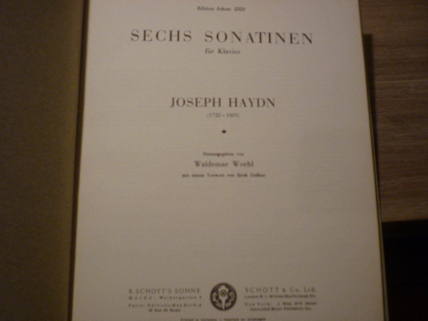 1. Haydn; Franz Joseph: Sammlung leichter Klavierstucke nach einem alten Notendruck neu herausgegeben von Kurt Herrmann; Edition Schott 2829 / B.S.S. 36192; 20 blz.; Boek in keurige onbeschreven nieuwstaat 2. Haydn; Franz Joseph: Sechs Sonatinen fur Klavier, herausgegeben von Waldemar Woehl; Edition Schott 2333 / B.S.S. 33894; 27 blz.; Boek in keurige onbeschreven nieuwstaat 3. Sechs Esterhazy-Sonaten fur Klavier (Cembalo); Heft I (Sonate 1-3); herausgegeben von Bruno Maerker; Edition Schott 2357; B.S.S. 34374a; 35 blz. Boek in keurige onbeschreven nieuwstaat 4. Sechs Esterhazy-Sonaten fur Klavier (Cembalo); Heft II (Sonate 4-6); herausgegeben von Bruno Maerker; Edition Schott 235; B.S.S. 34374b; 24 blz. Boek in keurige onbeschreven nieuwstaat |