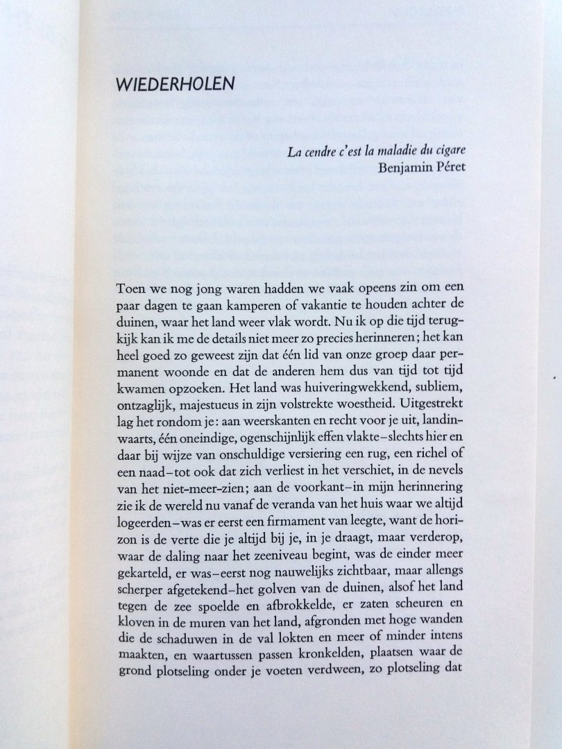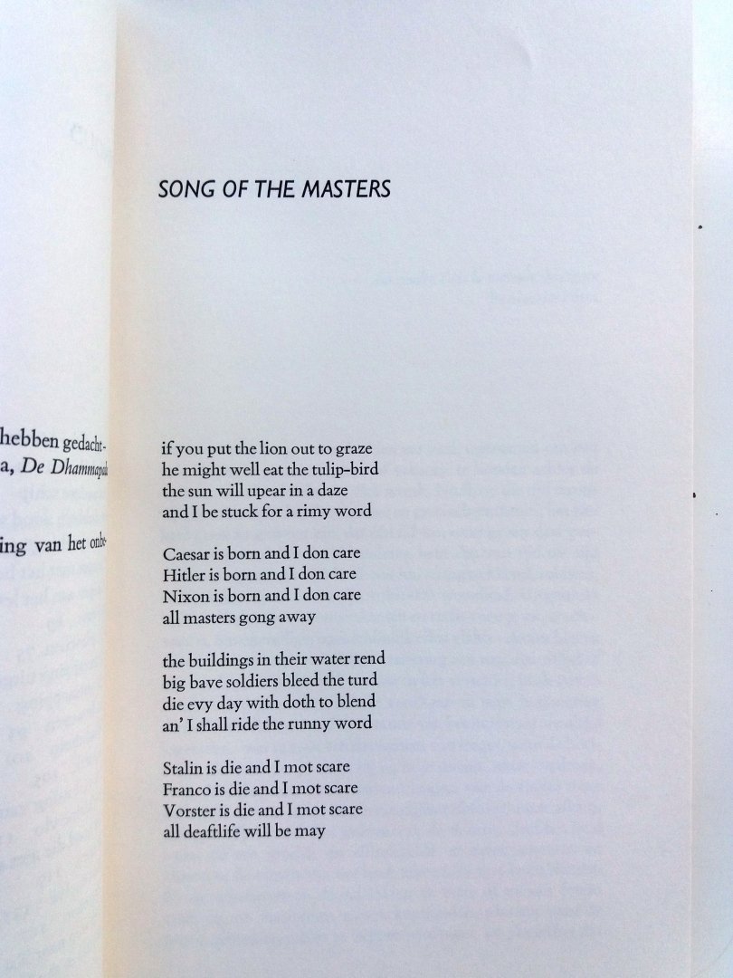 (Verhalen uit Mouroir) (Meulenhoff - Amsterdam) ISBN 9029016043 uitgave uit 1984 149 pp paperback met flappen (in goede staat!) Staat van het boek: 8.5 Dit boek is een verzamelbundel van verhalen die de Zuidafrikaan Breytenbach schreef aan de hand van aantekeningen die hij in de gevangenis maakte. Breytenbach was gevangen gezet n.a.v. zijn opstelling tegen het bewind in zijn land, vooral tegen de apartheid. Er staan twintig verhalen in, die een grote verscheidenheid van onderwerpen en grote verschillen qua stijl en genre laten zien. Naast verhalen die rechtstreeks op de gevangenschap betrekking hebben, komen er ook verhalen n.a.v. herinneringen in voor, absurde verhalen, en ogenschijnlijke humoristische verhalen, vaak met een grimmige ondertoon ("De hoed die niet naar de hemel ging"). Het taalgebruik van Breytenbach is zeer beeldend, en achter de schijnbaar eenvoudige, makkelijke vertelstijl gaan verrassende inzichten schuil. Het boek is niet gemakkelijk, maar bij geconcentreerde lezing in alle opzichten verrijkend. Prijs €4,- |