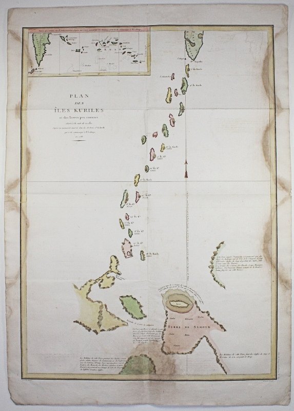 | Titel: | Plan des Iles Kuriles et des terres peu connues situees a la suite de ces Iles d'apres au manuscrit conserve dans les Archives d'Ochotsk qui a ete communique a M. Lesseps, en 1788 |