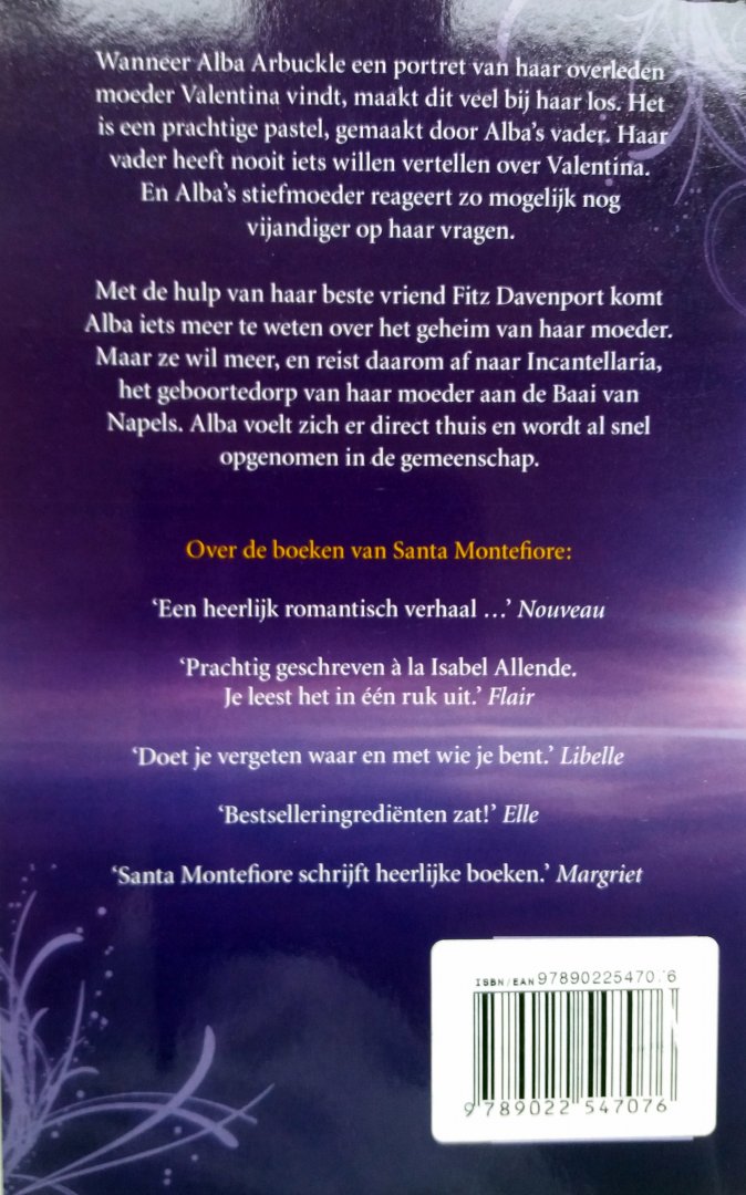 (De Boekerij - Amsterdam) ISBN 9789022547076 4e druk 2007 336 pp pocket/paperback ***NIEUWSTAAT*** Staat van het boek: 10.0 Alba Arbuckle heeft het gevoel dat ze vastzit. Dat gevoel wordt sterker wanneer ze een portret vindt van haar overleden moeder Valentina, die ze nooit heeft gekend. Nooit heeft haar vader iets willen vertellen over haar moeder en haar stiefmoeder reageert zo mogelijk nog vijandiger op haar vragen. Met de hulp van haar beste vriend Fitz komt Alba iets meer te weten over haar moeder, maar ze besluit dat ze het hele geheim wil ontrafelen. Ze reist in haar eentje naar Incantellaria, het dorpje aan de Baai van Napels waar haar moeder vandaan kwam en waar Alba stukje bij beetje achter de waarheid komt.Recensie(s)De rusteloze Alba leidt een doelloos leven met veel wisselende vriendjes. Als ze een portret vindt van haar moeder Valentina, die ze nooit heeft gekend, zet ze alles op alles om de waarheid over haar te achterhalen. Haar zoektocht brengt haar in Italië, waar haar vader tijdens de Tweede Wereldoorlog was gelegerd toen hij de beeldschone Valentina ontmoette. Alba voelt zich helemaal thuis bij haar familie in Italië, dat maakt de keuze om terug te keren naar haar vriend in Engeland moeilijk. Deze roman vertelt beetje bij beetje het dramatische verhaal van Valentina. Uiteindelijk blijkt de waarheid over haar schokkend, maar niet onoverkomelijk. Levensechte reacties van mensen die elkaar willen beschermen tegen slecht nieuws, maar daardoor een grote afstand scheppen. Een boeiend romantisch verhaal. Prijs €4,- |