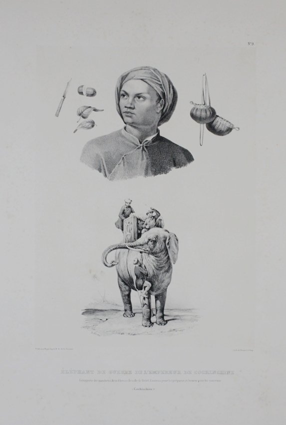 Shows at the top a native of Cochinchina, Vietnam, and at the bottom an asiatic elephant.