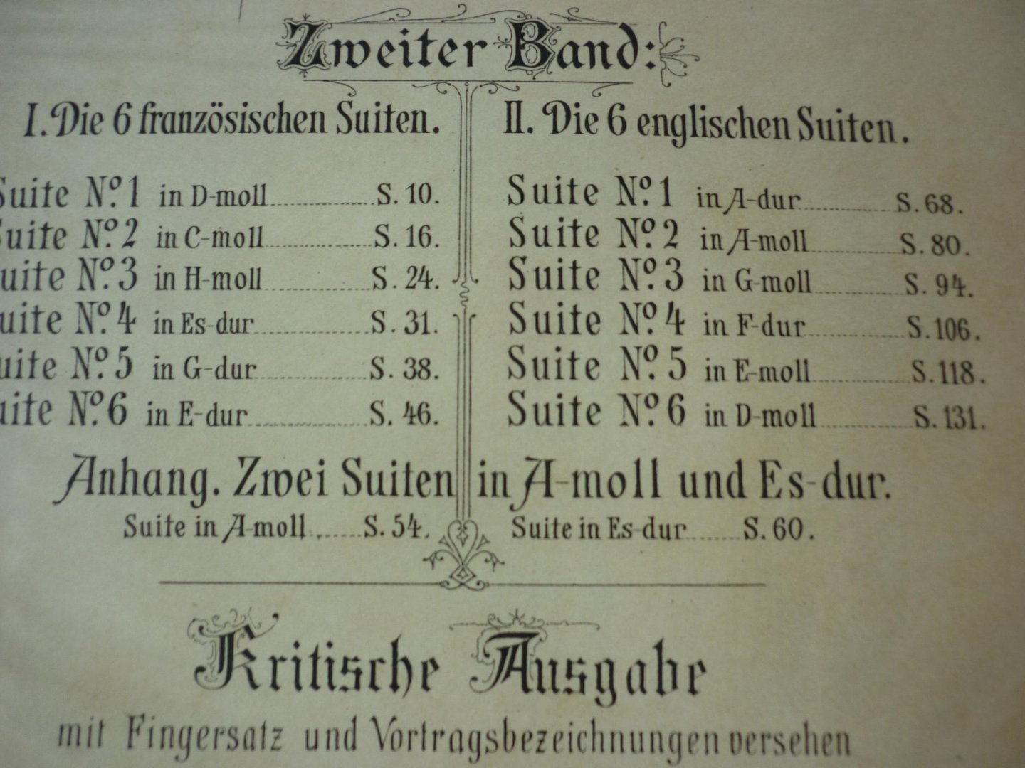 Inhoud band II, heft I en heft II; Originele uitgave uit 1881: Französische Suite Nr. 1 d-Moll BWV 812 Französische Suite Nr. 2 c-Moll BWV 813 Französische Suite Nr. 3 h-Moll BWV 814 Französische Suite Nr. 4 Es-Dur BWV 815 Französische Suite Nr. 5 G-Dur BWV 816 Französische Suite Nr. 6 E-Dur BWV 817 Suite a-Moll BWV 818 Suite Es-Dur BWV 819 Englische Suite Nr. 1 A-Dur BWV 806 Englische Suite Nr. 2 a-Moll BWV 807 Englische Suite Nr. 3 g-Moll BWV 808 Englische Suite Nr. 4 F-Dur BWV 809 Englische Suite Nr. 5 e-Moll BWV 810 Englische Suite Nr. 6 d-Moll BWV 811 -------------------------------------------------- Inhoud Band III, Originele uitgave uit 1882: 1. Die 6 Partiten aus dem ersten Theil der Clavierubung 2. Die ouverture nach franzosischer Art oder die H-moll Partita aus dem zweiten Theil der Clavierubung S96 |