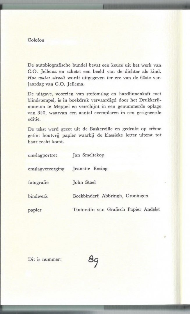 Uitstekende staat. Deze autobiografische bundel bevat een keuze uit het werk van C.O. Jellema en schetst een beeld van de dichter als kind. 'Hoe water streelt' werd uitgegeven ter ere van de 60ste verjaardag van C.O. Jellema. Dit exemplaar is nummer 89 van een genummerde oplage van 350 exemplaren. |