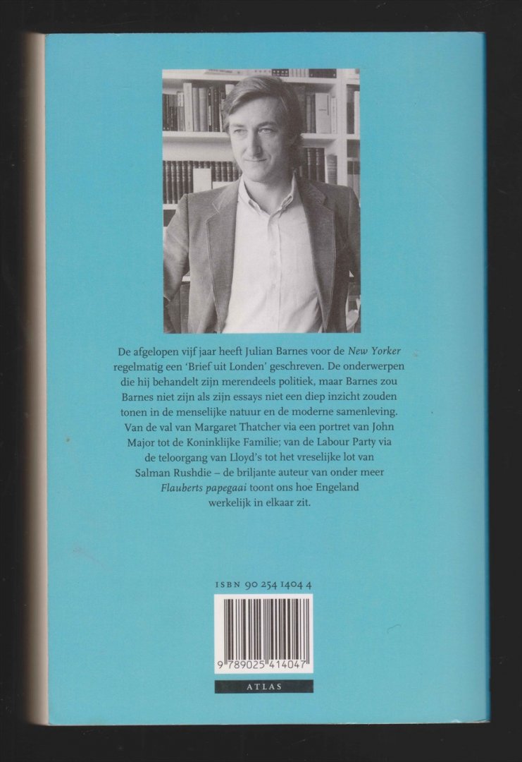 Brieven uit Londen Atlas, Amsterdam/Antwerpen. 1996. Eerste druk. Paperback (gebrocheerd, garenloos). Papieren band. 367 pp. 13½ x 21 x 3¼ cm. 508 gr. Oorspronkelijke titel Letters from London 1990-1995, 1995. Vertaald door Ronald Cohen, hoofdstuk door Else Hoog. Omslagontwerp Marjo Starink. Omslagillustratie ABC Press. Foto auteur Jerry Bauer. Typografie Arjen Oosterbaan. ISBN-10 90 254 1404 4. ISBN-13 978 90 254 1404 7. De afgelopen vijf jaar heeft Julian Barnes voor de New Yorker regelmatig een 'Brief uit Londen' geschreven. De onderwerpen die hij behandelt zijn merendeels politiek, maar Barnes zou Barnes niet zijn als zijn essays niet een diep inzicht zouden tonen in de menselijke natuur en de moderne samenleving. Van de val van Margaret Thatcher via een portret van John Major tot de Koninklijke Familie; van de Labour Party via de teloorgang van Lloyd's tot het vreselijke lot van Salman Rushdie - de briljante auteur van onder meer Flauberts papegaai toont ons hoe Engeland werkelijk in elkaar zit. Naam op binnenzijde voorplat. Lichte leesvouwen op ietwat holle rug. Net exemplaar. In prima staat. BOOKNUMBER: 22638 |