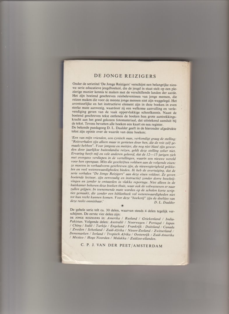 | Meer info: | vertaling: A.J. Richel; gebonden in slap gedecoreerd karton; belettering in wit en zwart; deeltje uit de ca. 30 delen tellende serie 'De Jonge Reizigers'; |