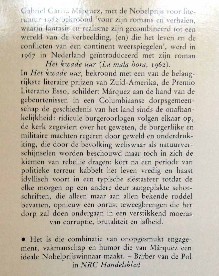 (Meulenhoff - Amsterdam) ISBN 90 290 1583 7 6e druk 1983 176 pp paperback (zo goed als nieuw!) Staat van het boek: 9.0 In Het kwade uur schildert Gabriel García Márquez aan de hand van de gebeurtenissen in een Colombiaans dorpje de geschiedenis sinds de onafhankelijkheid. Ridicule burgeroorlogen volgen elkaar op, de kerk zegeviert over het geweten en de burgerlijke en militaire machten regeren door geweld en onderdrukking. Niet lang na een periode van politieke terreur kabbelt het leven weer vredig voort in een typische siëstasfeer. Tot de schotschriften die elke morgen op een andere deur worden aangeplakt niet langer de algemeen bekende roddels bevatten, maar opnieuw voor onrust zorgen in het dorp. Recensie(s) Na de laatste politieke omwenteling is de siesta in een Colombiaans dorpje schijnbaar rustig. Maar de afgunst is er onder de oppervlakte en opschriften, die iedere nacht op een andere deur worden geplakt en de bekende roddel over corruptie en zedeloosheid bevatten, prikkelen de emoties. De kerk kalmeert... te laat, als de militaire macht haar gewelddadig werk al heeft gedaan en de spanning zich ontlaadt in een nieuwe zinloze revolutie. Een uitnemende roman, waarin de steeds wisselende personen prachtig zijn getekend en de beklemmende sfeer van hitte, stank van verrotting en zich opladende emoties, op voortreffelijke manier voelbaar zijn gemaakt. Prijs €4,- |