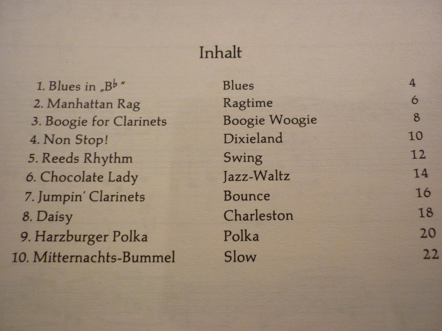 Content Blues in B Manhatten Rag Boogie for Clarinets Non stop! Reeds Rhythm Chocolate Lady Jumpin' Clarinets Daisy Harzburger Polka Mitternachtsbummel |