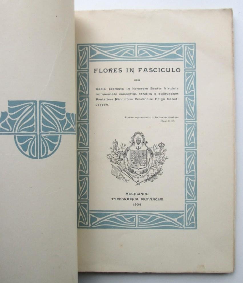 Katholieke bundel religieuze gedichten ter ere van de Heilige Maagd Maria; met bijdragen van o.a. Fr. Salvator Palmen, Josephus Coolen, Fr. Valerius Mahy en Fr. P. Jean-Baptiste Minne. Met index. Tekst in het Latijn, Frans en Nederlands. Softcover art nouveau omslag, typografie, florale decoratie en kaders.