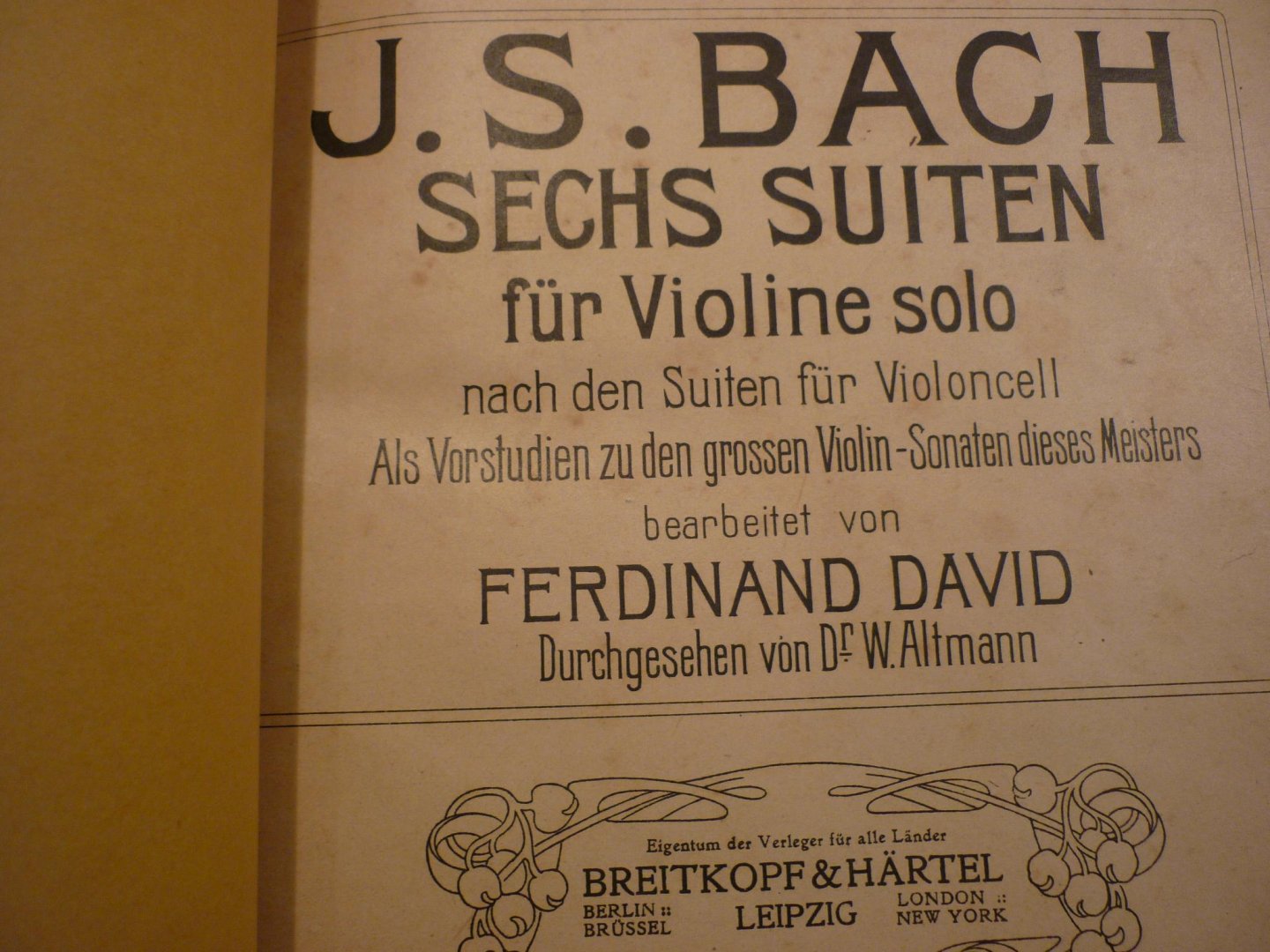 | Titel: | Sechs Suiten fur Violine solo; nach den suiten fur Violoncell + Chaconne (Als Vorstudien zu den grossen Violin-Sonaten dieses Meisters, bearbeitet von Fred. David. (Dr. W. Altmann) |