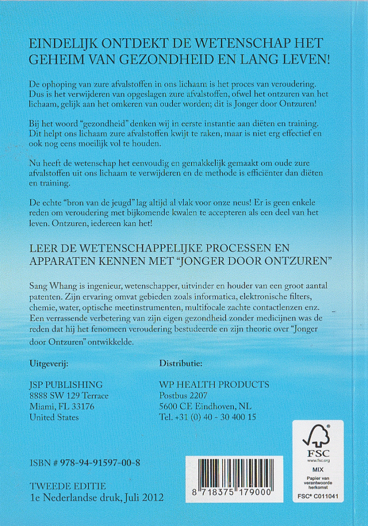 Bij het woord "gezondheid" denken wij in eerste instantie aan diëten en training. Dit helpt ons lichaam zure afvalstoffen kwijt te raken, maar is niet erg effectief en ook nog eens moeilijk vol te houden. Nu heeft de wetenschap het eenvoudig en gemakkelijk gemaakt om oude zure afvalstoffen uit ons lichaam te verwijderen en de methode is efficiënter dan diëten en training. De echte "bron van de jeugd" lag altijd al vlak voor onze neus! Er is geen enkele reden om veroudering met bijkomende kwalen te accepteren als een deel van het leven. Ontzuren, iedereen kan het! San Whang is ingenieur, wetenschapper, uitvinder en houder van een groot aantal patenten. Zijn ervaring omvat gebieden zoals informatica, elektronische filters, chemie, water, optische meetinstrumenten, multifocale zachte contactlenzen enz. Een verrassende verbetering van zijn eigen gezondheid zonder medicijnen was de reden dat hij het fenomeen veroudering bestudeerde en zijn theorie over "Jonger door Ontzuren" ontwikkelde. |